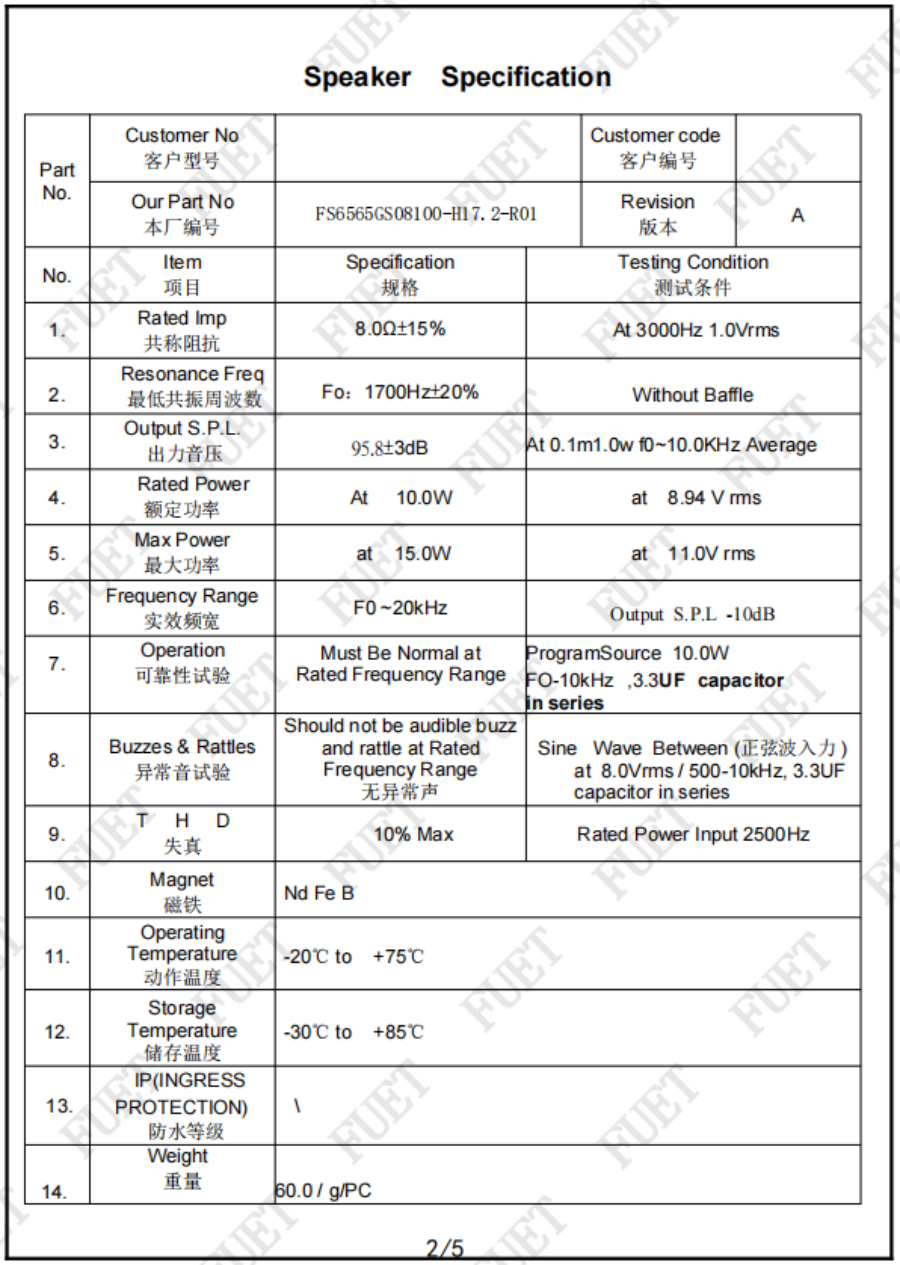 出力音壓 95.8±3dB At 0.1m1.0w f0~10.0KHz Average